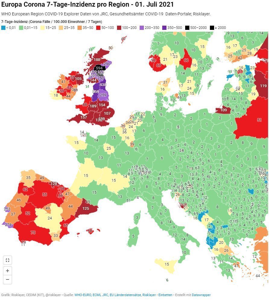 Regions of the UK, notably central Scotland, now represent the highest infection rates in Europe.