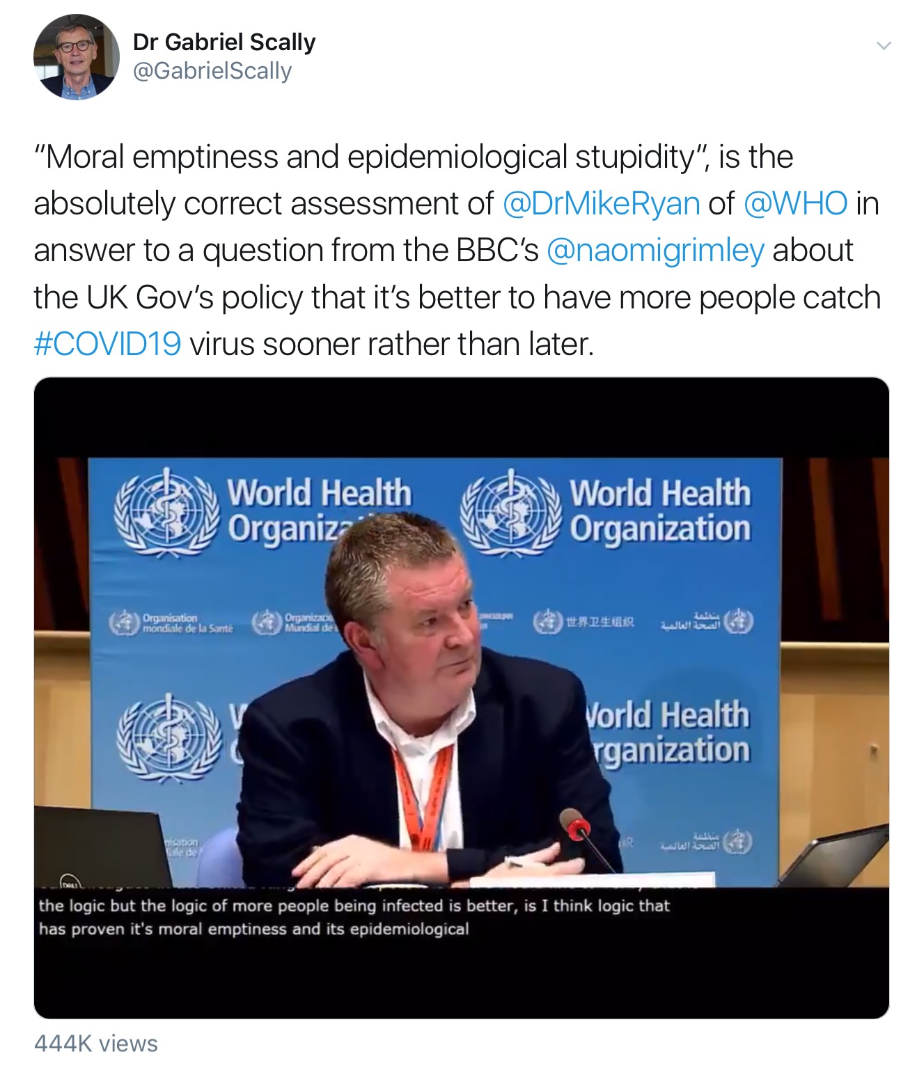 Head of the World Health Organisation, Mike Ryan, has referred to the UK’s latest policy decision as “moral emptiness and epidemiological stupidity.”